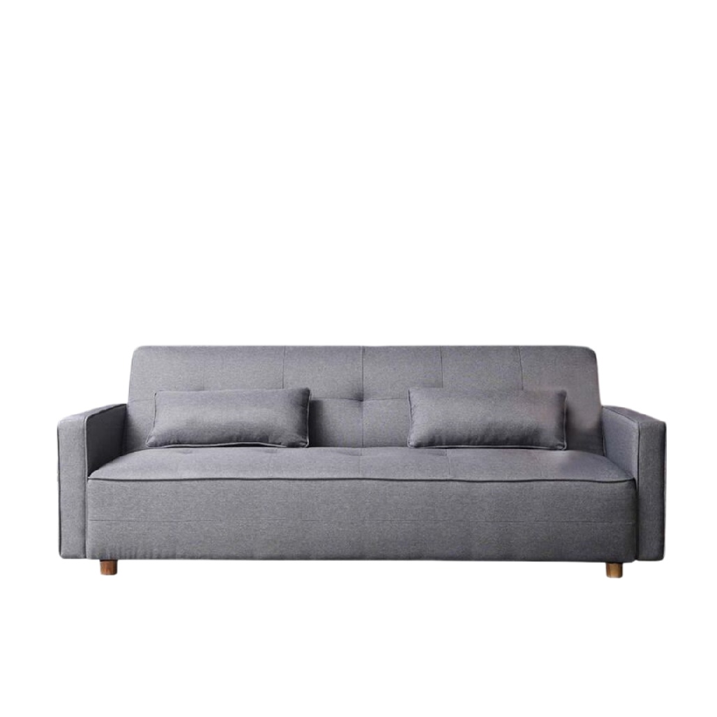 Canapé gris moderne avec coussins intégrés.