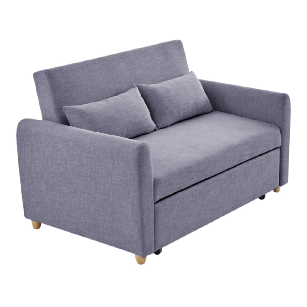 Canapé convertible gris clair avec rangement intégré et coussins.