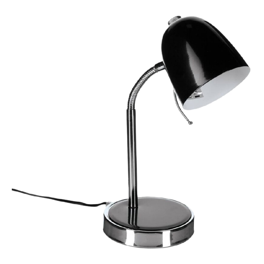 Lampe de bureau noire avec bras articulé et base en métal brillant.