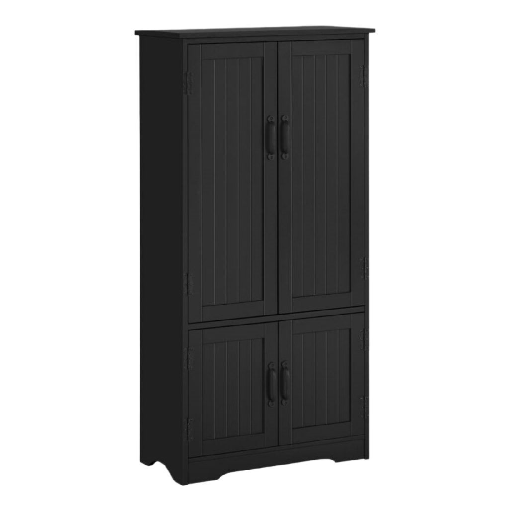 Armoire en bois noir à quatre portes avec design à lamelles.
