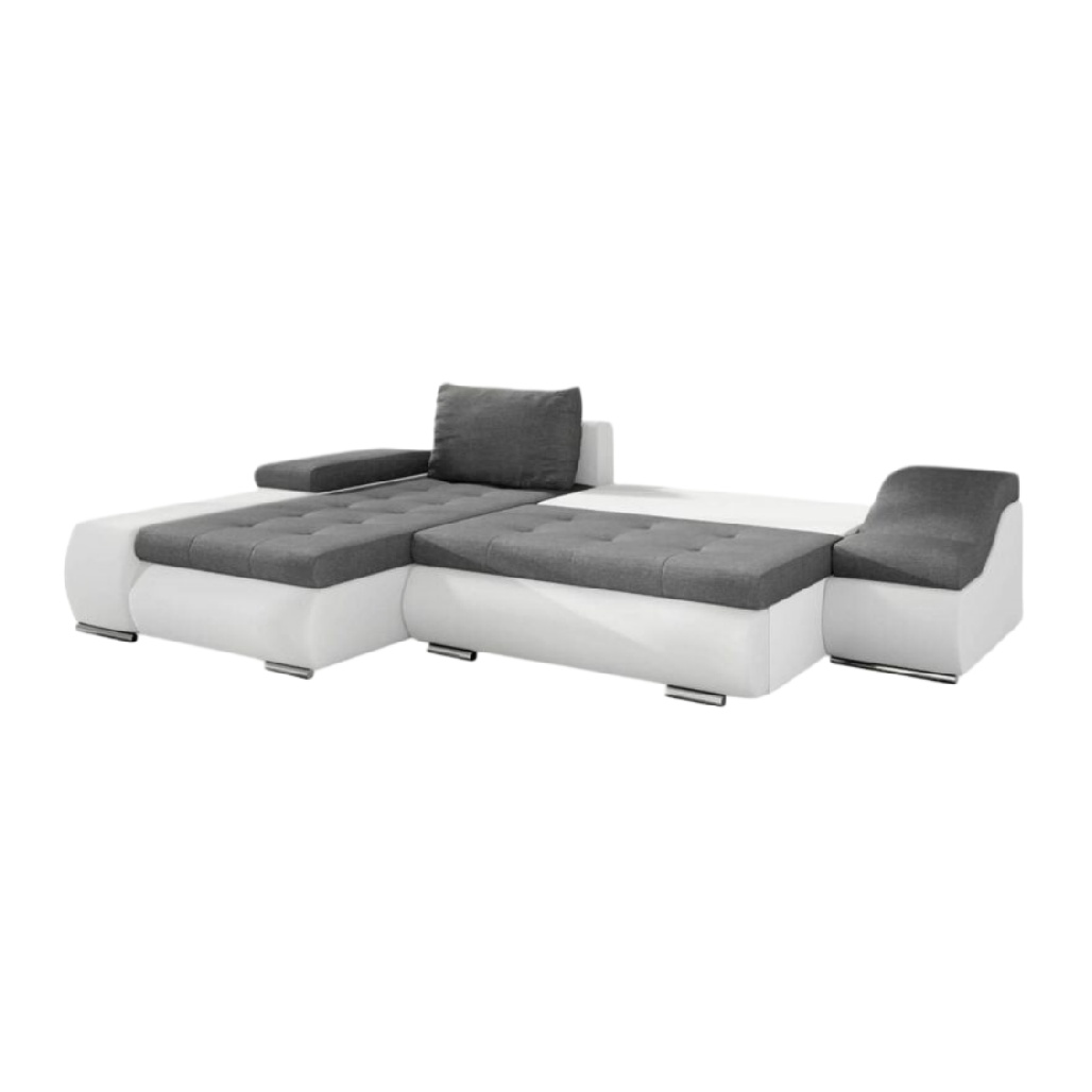Canapé d'angle moderne, tissu gris et blanc, convertible avec espace de rangement.