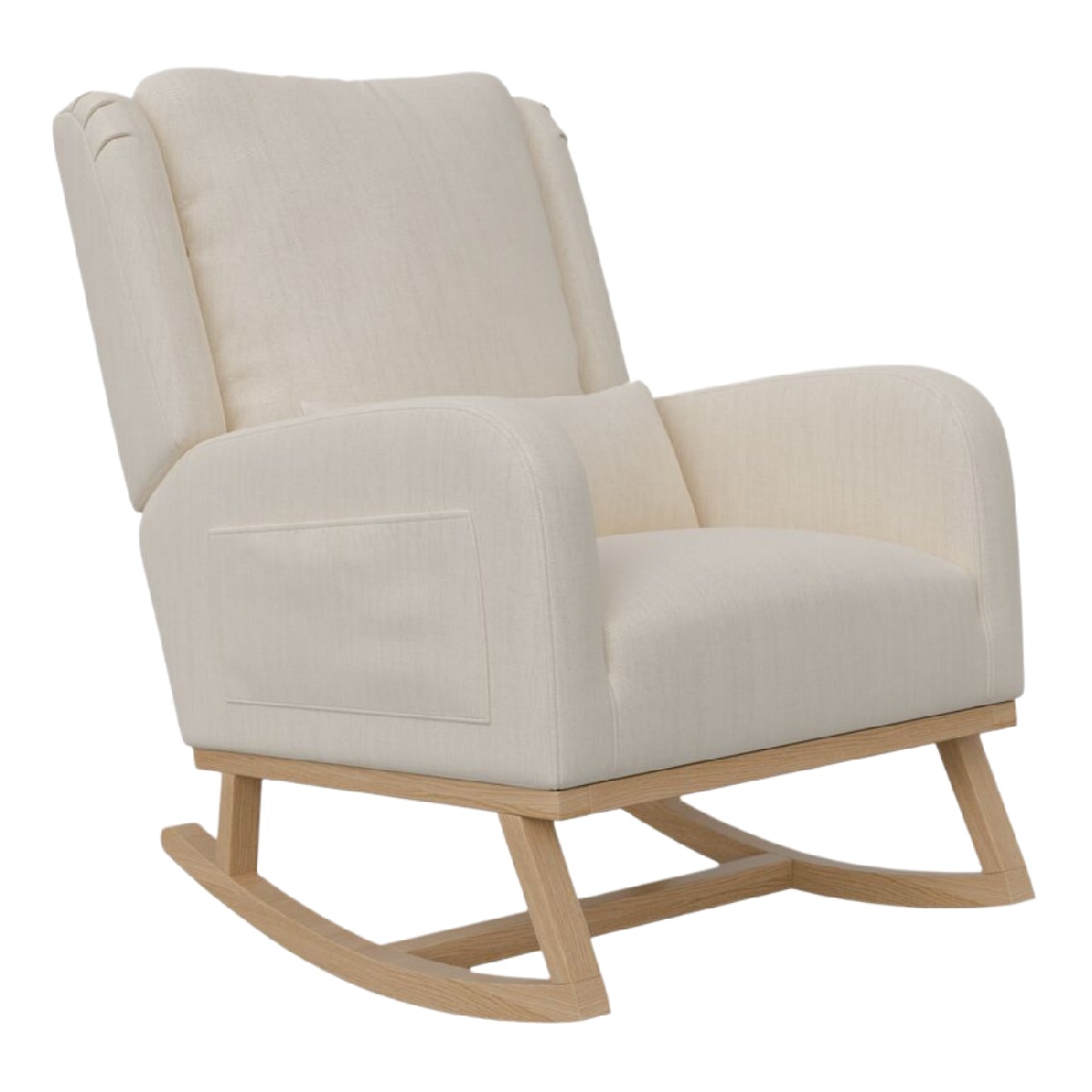 Fauteuil à bascule en tissu beige avec structure en bois clair